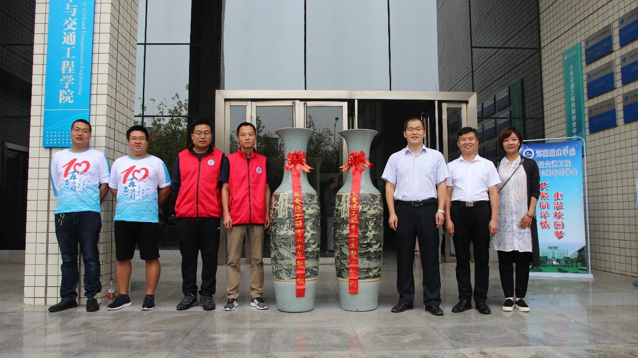 10月4日上午,2005级交通工程专业毕业十周年回馈母校礼物捐赠仪式在十号教学楼土木与交通工程学院大门口隆重举行,同学们向母校捐赠了一对印有清明上河图图案的景德镇仿古落地大花瓶,李爱增副院长代表学院接收捐赠并合影留念。随后,在十号教学楼C座二楼会议室召开了师生座谈会,教师代表吴近勇、王小召、尹振羽、李爱增、宋明磊、刘丽华、李荣荣出席,座谈会由宋帅奇老师主持。宋帅奇老师首先代表学院领导班子和全体师生对同学们十年后返校举行系列纪念活动表示欢迎,对同学们对母校的认可与鼓励表示感谢。紧接着,李爱增副院长为同学们详细介绍了学校、学院和交通工程专业发展情况;宋帅奇老师补充介绍了学院十年来的发展成就及教学科研平台建设情况;吴近勇老师勉励同学和青年教师要有格局,有情怀、有担当,敬业爱岗、爱国奉献、拼搏进取、充满正能量,要常问自己 “上进了吗、爱国了吗”,督促自己成长,争取更上一层楼;王小召老师分享了自己创业和发展经验,勉励大家要珍惜同学情谊、拓展人脉资源、虚心学习、怀揣梦想、积极行动、只争朝夕。随后,同学们一一介绍了自己十年来的工作变迁、求学经历、典型成就和目前从事的主要工作。会后,分别由李爱增老师和宋帅奇老师带领大家参观了河南省智慧交通决策规划和管理工程研究中心和结构工程实验室。