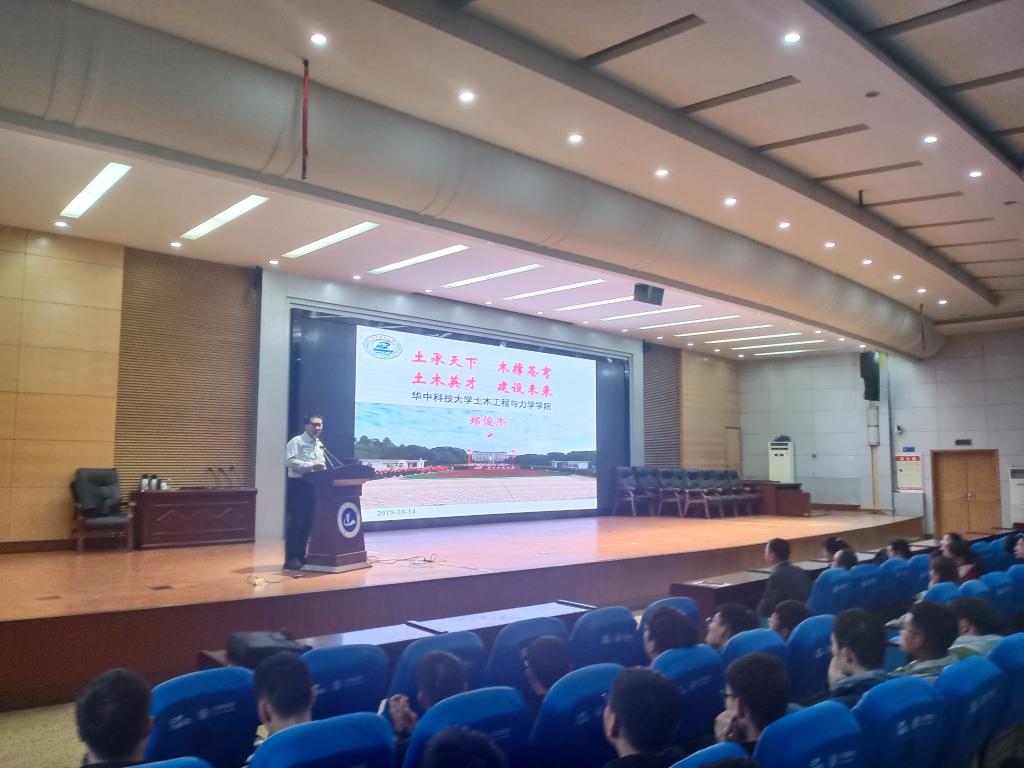 10月14日下午,在行政楼报告厅郑俊杰教授为土木与交通工程学院数四百多名师生做了以“土承天下 木撑苍穹 土木英才 建设天下”为主题的学术报告。郑教授首先对土木工程专业的过去、现在和未来进行了讲解、分析和展望,强调了土木工程对人类生活的贡献。接着,结合自身的工作、学习、生活经历,就如何规划自己的大学生活跟同学们进行了讨论交流。强调只有身体好,才能学习好,以及“情商”的重要性。在随后的提问互动环节,同学们积极踊跃,面对同学们的问题,郑教授都给予了充分耐心的解答,并寄语同学们热爱专业、立志高远,做好规划、认真学习、乐观生活,努力提高综合素质,做到全面发展。