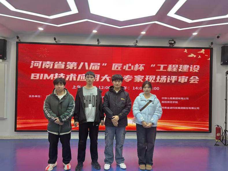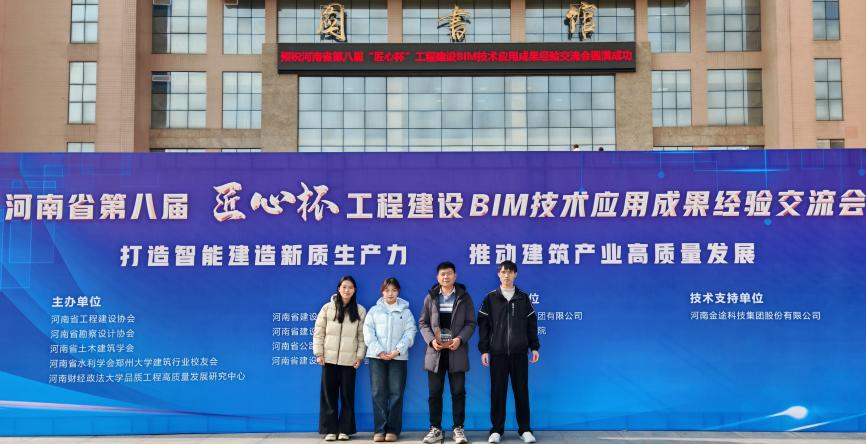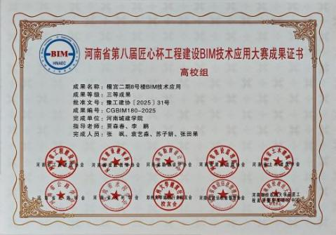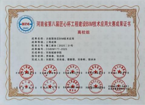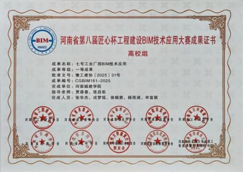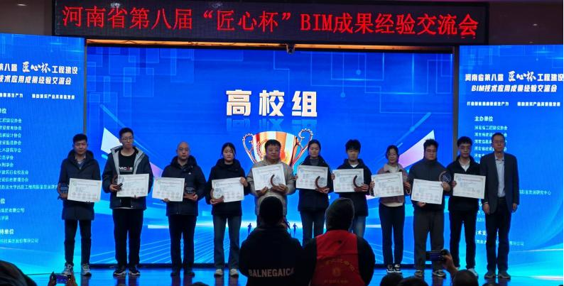 (通讯员 张启航 贾森春)2025年12月6日,河南省第八届“匠心杯”工程建设BIM技术应用大赛在河南财经政法大学成功举办,河南城建学院智能建造与交通工程学院BIM技术协同中心申报的“七号工业厂房BIM技术应用”项目凭借扎实的技术与突出的创新价值,在众多参赛作品中脱颖而出,荣获高校组一等成果。2026年1月10日,颁奖仪式在南阳师范学院隆重举行,项目指导老师贾森春、张启航代表团队领取荣誉证书与奖杯。