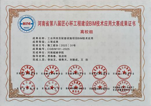 此次获奖成果不仅为我院相关专业教学提供了鲜活实践案例,也为BIM技术在工业建筑领域的深度应用提供了优秀范本。未来,智能建造与交通工程学院将以此次获奖为契机,进一步深化智能建造领域教学改革与科研创新,激励广大师生持续探索智能建造新质生产力,为推动河南省乃至全国建筑产业高质量发展贡献更多教育力量与技术智慧。(供稿 智能建造系)